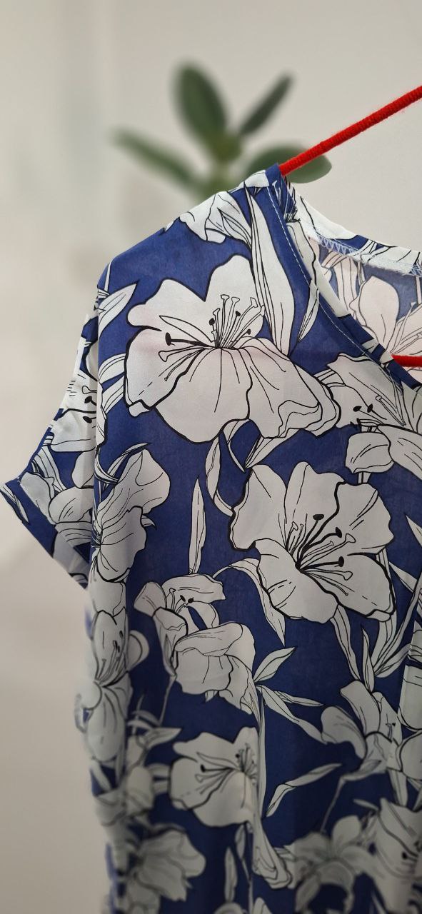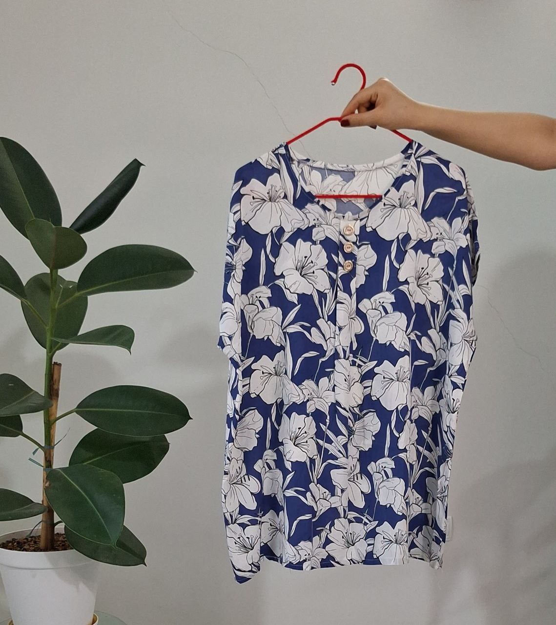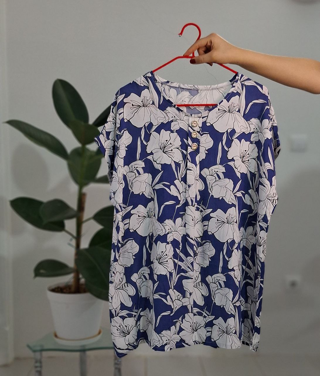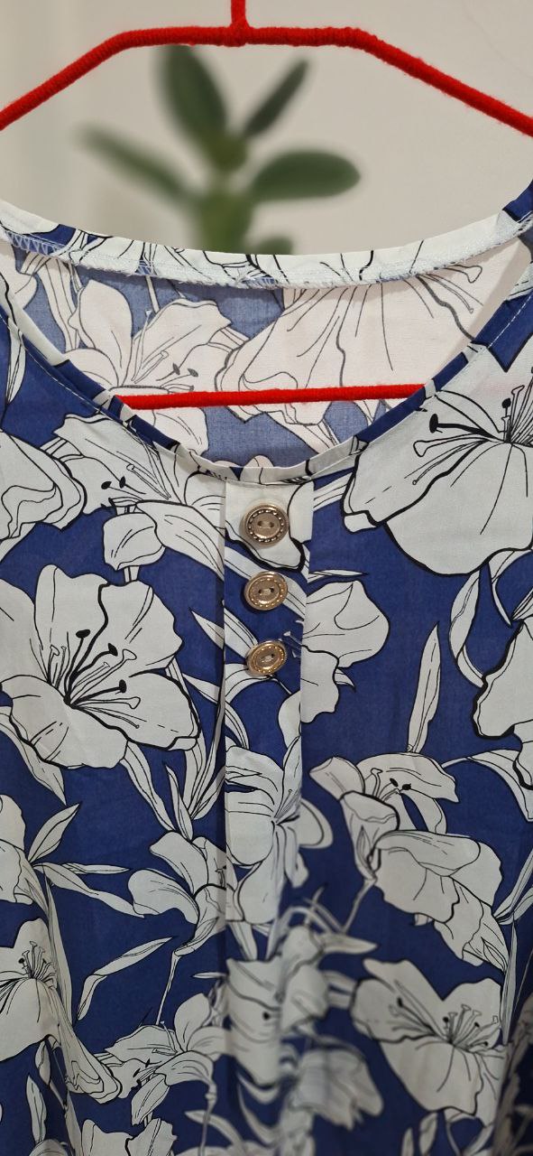 پیرهن سه دکمه نخی – گلدار زمینه آبی، فریسایز